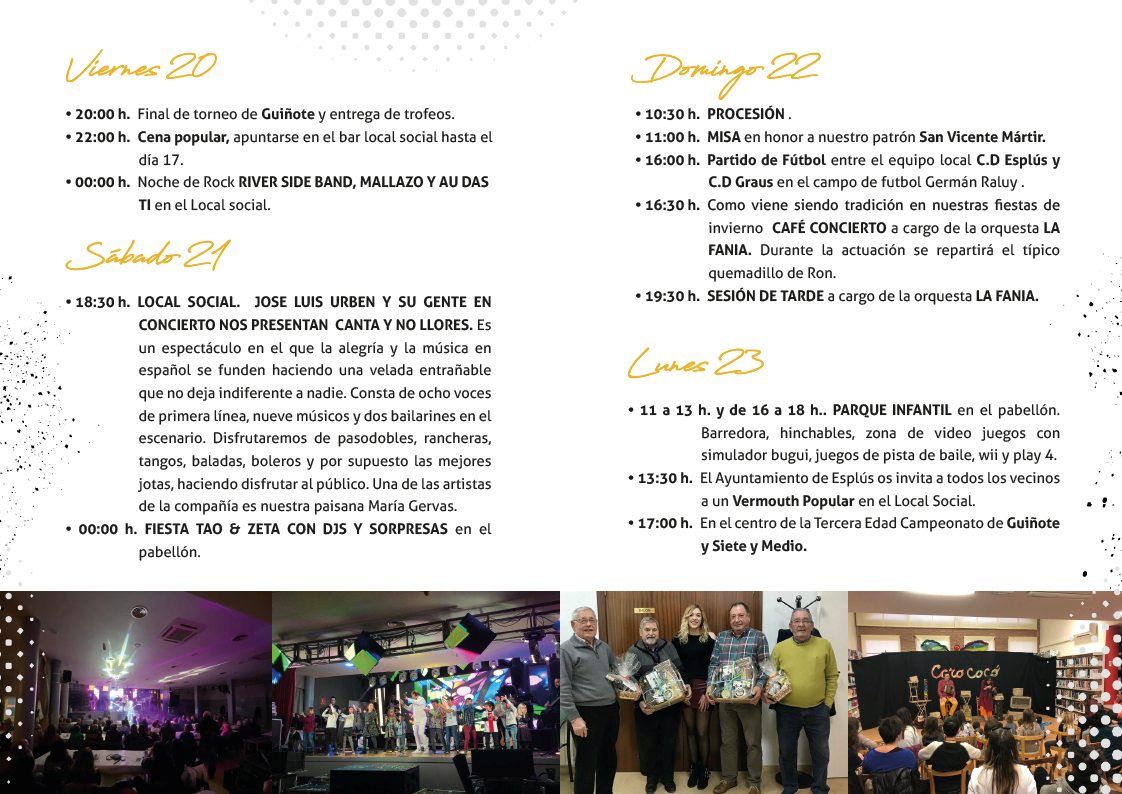 La alcaldesa de Esplús, Tania Soláns, ha hablado de la programación prevista para la celebración de las fiestas de invierno de esta población literana en honor a San Vicente Mártir. En su programación podemos encontrar “La noche de Rock”, un concierto en el que actuarán grupos como la River Side Band, Mallazo y Au D’Asti.
