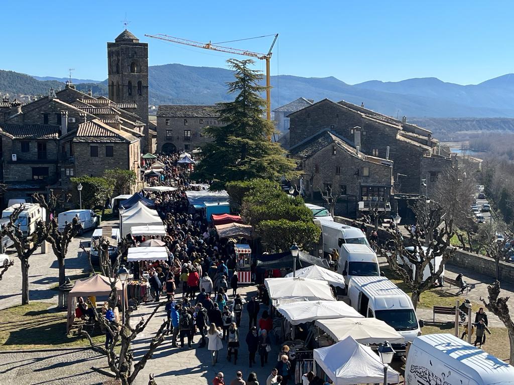 Todo comenzaba a las diez de la mañana con la exposición y la venta de productos artesanos llegados de diferentes puntos de la geografía española y de los vecinos valles franceses. Embutidos, artesanía en piel y madera, cosmética natural, fruta deshidratada, mermeladas, bacalao, zumos, panadería y repostería, textil, bisutería o antigüedades podían adquirirse desde la explanada del Castillo hasta alcanzar la Plaza Mayor. Hueco tenían igualmente los estudiantes de 4º de la ESO del instituto, que recaudaban fondos para su viaje de fin de curso, y las voluntarias de Cáritas Sobrarbe vendiendo productos de comercio justo.
