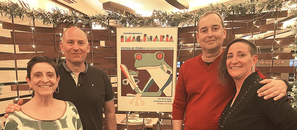 IMAGINARIA, el festival de títeres e imagen en movimiento que se celebrará en Binéfar del 30 de mayo al 4 de junio y que organiza el Ayuntamiento, ha iniciado esta misma tarde su cuenta atrás con el tradicional acto de presentación en sociedad del cartel de la presente edición, la décima, ante las empresas y entidades colaboradoras con el certamen; todos se reunían en el restaurante Di Marco en un encuentro ya tradicional.  El cartel es obra de un veterano ilustrador aragonés, José Luis Cano (Zaragoza, 1948) que ha rendido homenaje en su trabajo a los tradicionales títeres de cachiporra a la vez que juega con la doble personalidad para reflexionar sobre esta característica humana que tanto le interesa. La icónica rana de IMAGINARIA es la protagonista del cartel: “Es el animal tótem del festival y decidí hacer una rana titiritera con un títere que también es otra rana con un as de bastos en alusión a los títeres de cachiporras que son los más tradicionales. Busqué varios tipos de ranas y encontré una tropical que tenía muchos colores y pensé que le daría mucha más animación al cartel”, comenta el autor, agradecido por la invitación de Los Titiriteros de Binéfar, directores artísticos del certamen.