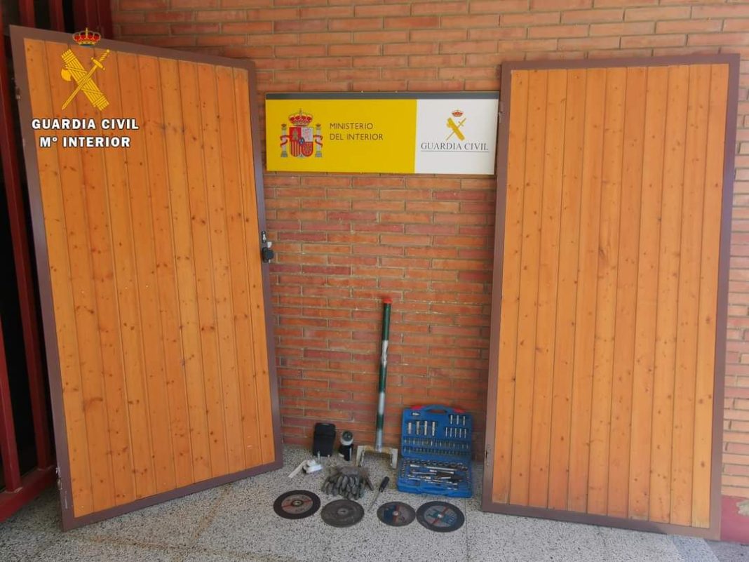 Tras la identificación de los detenidos y tras solicitar al conductor que mostrara lo que transportaba en el vehículo, se localizó en su interior la cámara de videovigilancia, dos puertas de madera hechas a medida, una tarjeta de memoria formateada, diversas herramientas, guantes, discos de corte de radial y un aparejo metálico de fabricación casera que utilizaban para levantar objetos pesados. Dado que las puertas sustraídas únicamente presentaban signos de fuerza en una de las bisagras, todo hace pensar que utilizaban esta herramienta para su elevación y posterior transporte.