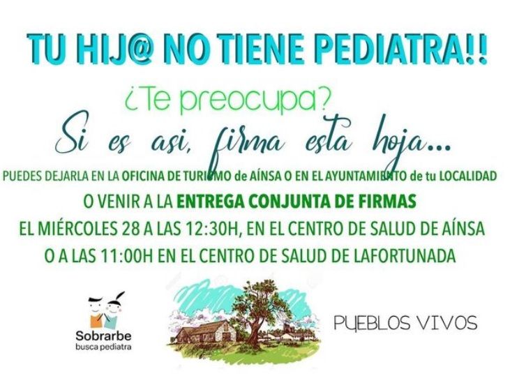El próximo miércoles 28 de junio la agrupación de familias de la comarca de Sobrarbe denominada “Sobrarbe busca Pediatra”, mostrará a través de una acto colectivo su descontento y preocupación ante la plaza vacante en Pediatría desde hace unas semanas.