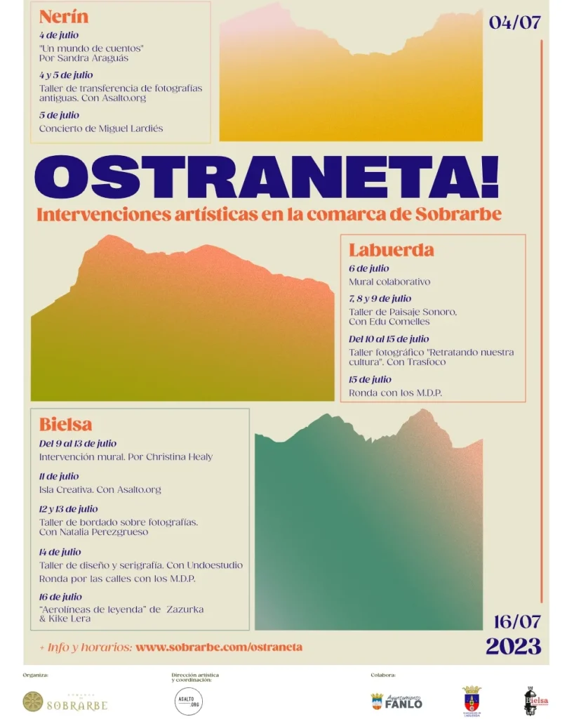 Trece días de intervenciones artísticas en Sobrarbe recorrerán las poblaciones de Nerín, Labuerda y Bielsa bajo el nombre de «Ostraneta!». El programa comienza este 4 de julio en Nerín con una sesión de cuentos y charrada a la fresca y finaliza en Bielsa el próximo 16 de julio con teatro itinerante.