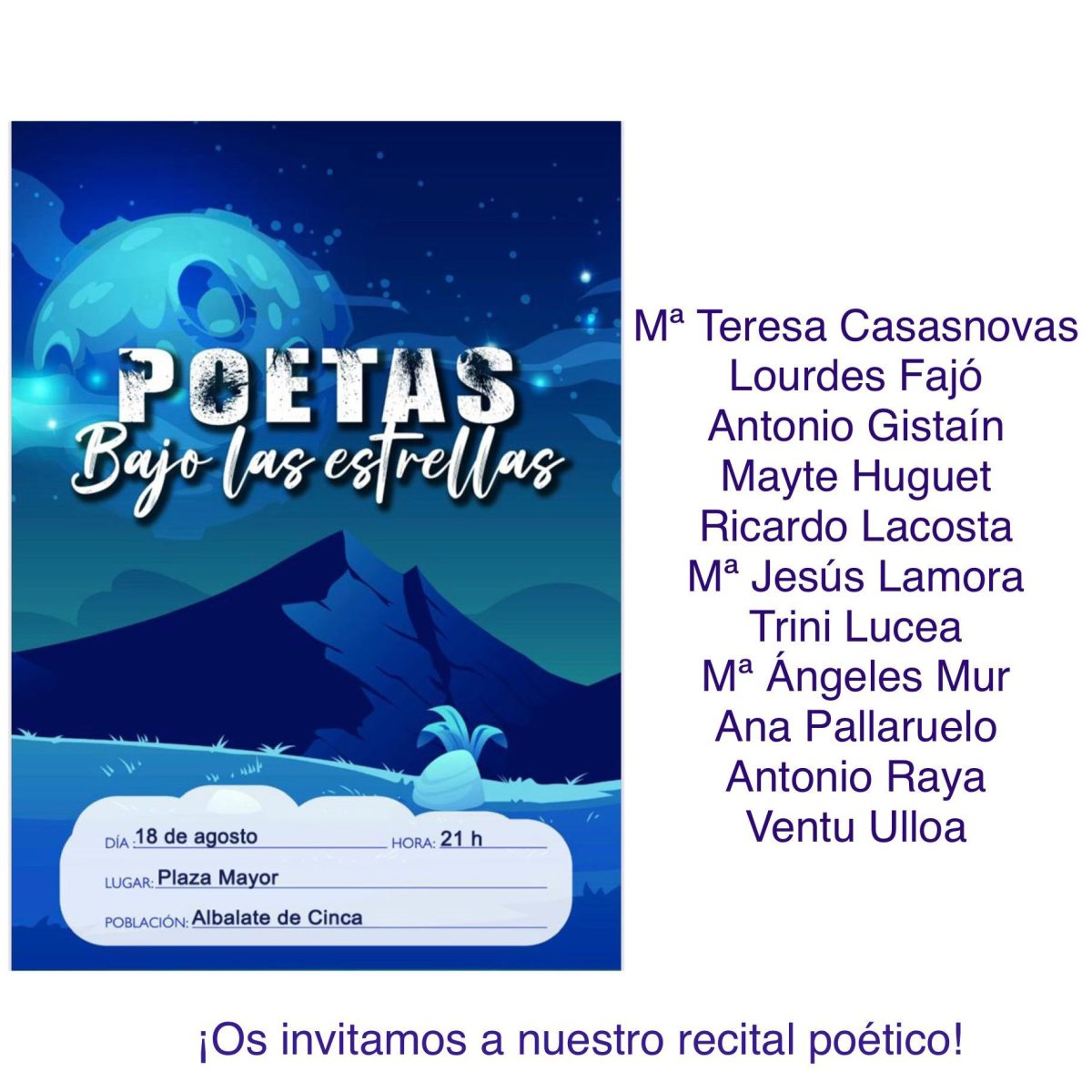 La plaza Mayor de Albalate de Cinca acoge a partir de las 21 horas de este viernes, 18 de agosto, un nuevo recital de los «Poetas Bajo las Estrellas». Un total de catorce hombres y mujeres participarán en dos rondas poéticas a dos voces con las que quieren hacer llegar este género a los municipios más pequeños. De esta iniciativa nos ha hablado Trini Lucea, una poeta navarra vinculada con este municipio de la comarca de Cinca Medio.