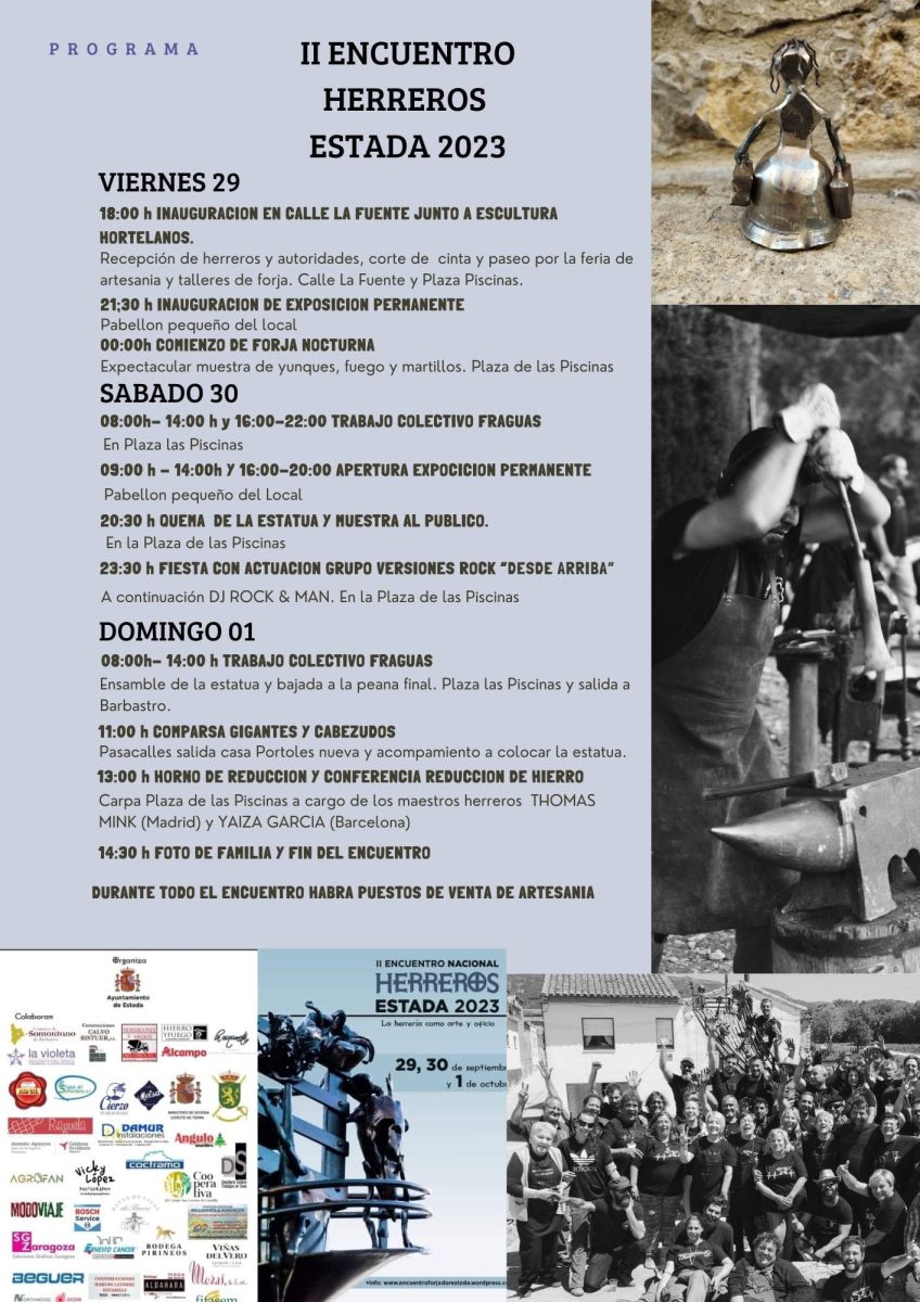 El alcalde de Estada nos ha invitado al encuentro de forjadores, el segundo que se celebra en esta localidad del Somontano, “una propuesta única”, a nivel nacional que reunirá a unos 50 herreros de todo el país que serán los encargados de realizar una estatua permanente que se colocará en el municipio. En esta ocasión su título será “Éxodo” y versará sobre la emigración rural gracias a la figura de un maestro abandonando el pueblo. Tres días de actividades con forja en directo, mercadillo artesano y muchas exhibiciones son los que nos esperan este fin de semana en Estada como nos ha explicado Valero Aguayos. También nos ha contado que hasta el próximo lunes, 2 de octubre, se pueden presentar ofertas para hacerse cargo del bar-restaurante, piscinas y multiservicio de la población, que hasta el momento está funcionando con personal contratado por el propio Consistorio.