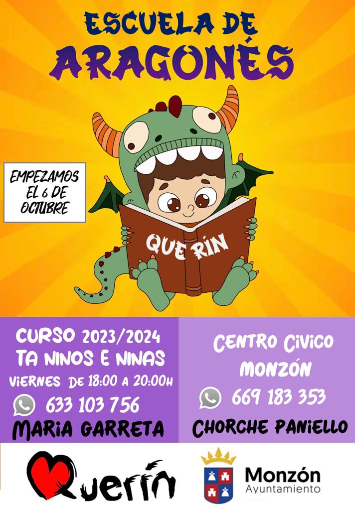 Monzón cuenta este curso con una Escuela de Aragonés, una iniciativa cuyas clases impartirá María Garreta, profesora titulada. La cita tendrá lugar los viernes de 18 a 20 horas en el Centro Cívico de Monzón y están dirigidas a niños, aunque si hubiera interés valoran crear un grupo de adultos. Una gran oportunidad para conocer esta lengua, que además estará muy presente en la I Semana Cultural -se llevará a cabo a finales de octubre- organizada por la Asociación Querím, en su programa podemos encontrar: visitas guiadas, la presencia del grupo local Mallazo, presentación de libros…, entre otras iniciativas de las que nos ha hablado Chorche Paniello.