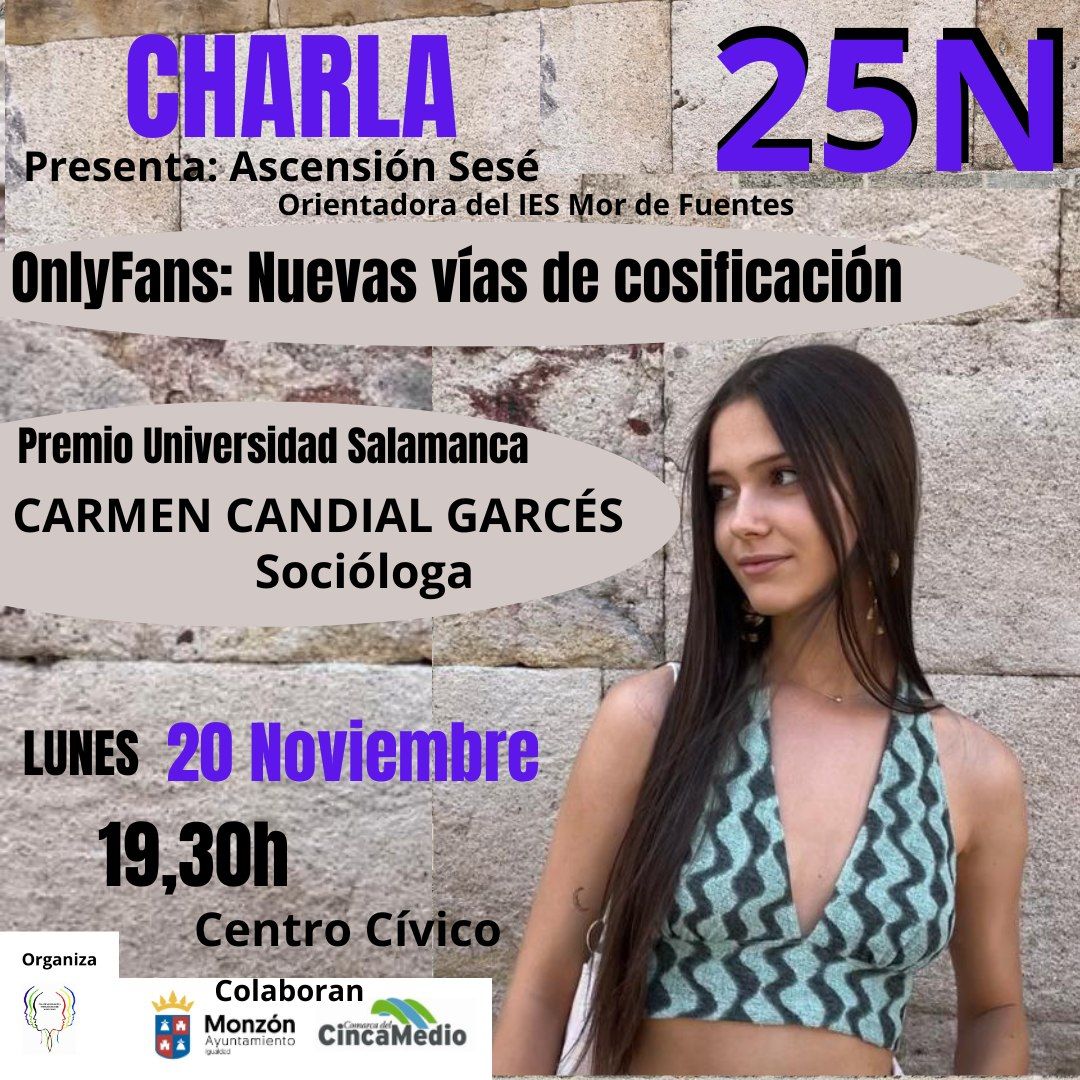 La socióloga montisonense ha analizado con nosotros el uso de plataformas como Onlyfans, tema que abordará en su charla con motivo del 25N que llevará a cabo este lunes 20 de noviembre, a las 19.30 horas en el Centro Cívico. Carmen en un estudio ha testeado qué visión tiene la gente joven sobre este tipo de plataformas y de todo el material que desde allí se suministra que sin duda contribuye a la cosificación de la mujer y su imagen que va más allá de una mera fotografía.
