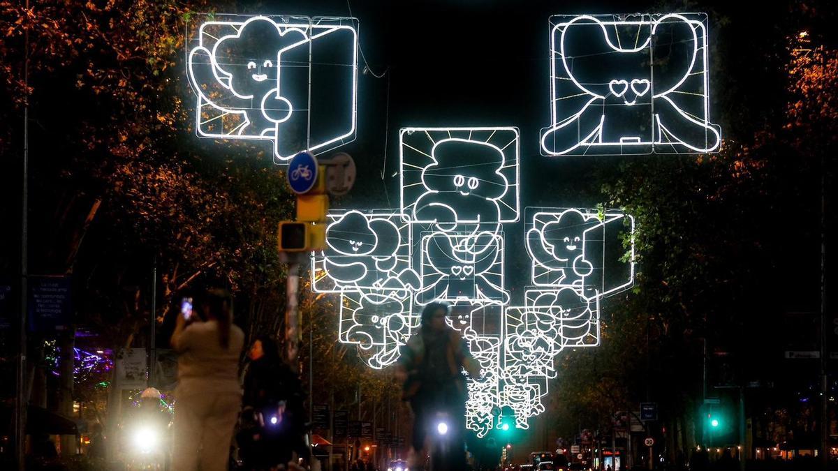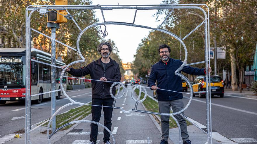 Con su estilo inequívoco de seres amables, singulares, curiosos, dulces y divertidos, los Mingarro han iluminado de figuras, ¿navideñas?, el paseo de Sant Joan. Geniales, una vez más. Vemos luces sobre el carril bici. Las hay sobre la calzada de los vehículos a motor. Y se han instalado también, distintas a las anteriores, sobre las aceras, y es en esas en las que los hermanos Mingarro han puesto más de la mitad de sus ilusiones, porque no penden perpendiculares al suelo, sino que lo hacen de forma oblicua, para, en el caso perfecto, conseguir que quienes pasean y quienes salen al balcón de sus casas crucen sus miradas a través de sus particulares viñetas. Lo dicho, puro estilo Brosmind. ¡Únicos!