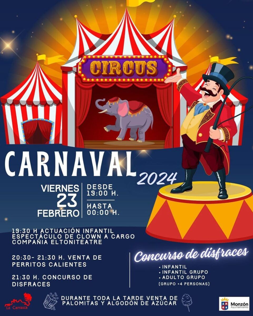 Monzón calienta motores de cara al carnaval con una fiesta circense en el Barrio La Carrasca. Para este viernes han organizado una tarde-noche en el circo con disfraces, atracciones de feria y también el reparto de perritos calientes que harán las delicias de aquellos que se acerquen al local de la asociación. Todos los detalles de la mano de su presidente, Javier Altemir.