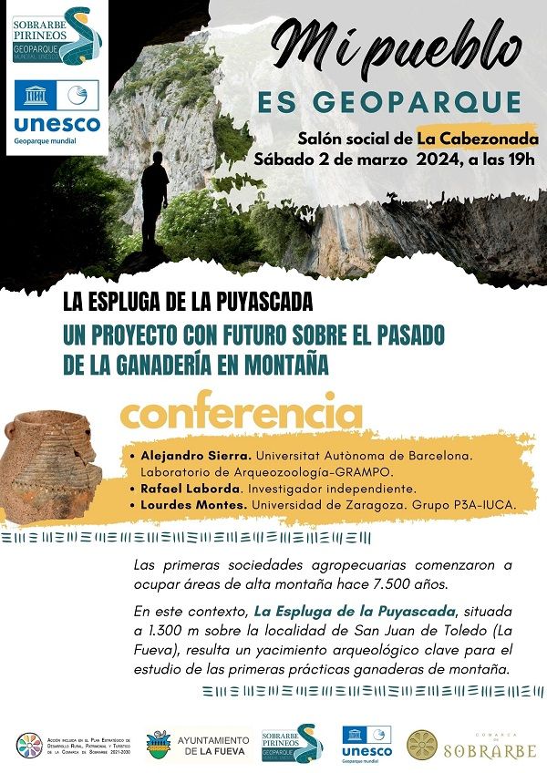 El Geoparque Mundial UNESCO Sobrarbe-Pirineos inaugura un nuevo programa llamado “Mi pueblo es Geoparque”. Se trata de una propuesta que se estrena este próximo sábado 2 de marzo en la localidad de La Cabezonada (La Fueva). Alejandro Sierra (Universitat Autònoma de Barcelona. Laboratorio de Arqueozoología-GRAMPO), Rafael Laborda y Lourdes Montes (Universidad de Zaragoza. Grupo P3A-IUCA) ofrecerán una charla para dar a conocer la Espluga de Puyascada. Un enclave conocido por los vecinos de La Fueva, pero en general muy desconocido, en el que se asentaron grupos humanos hace más de 7.500 años. El título de la charla es “La Espluga de la Puyascada. Un proyecto con futuro sobre el pasado de la ganadería en montaña”.