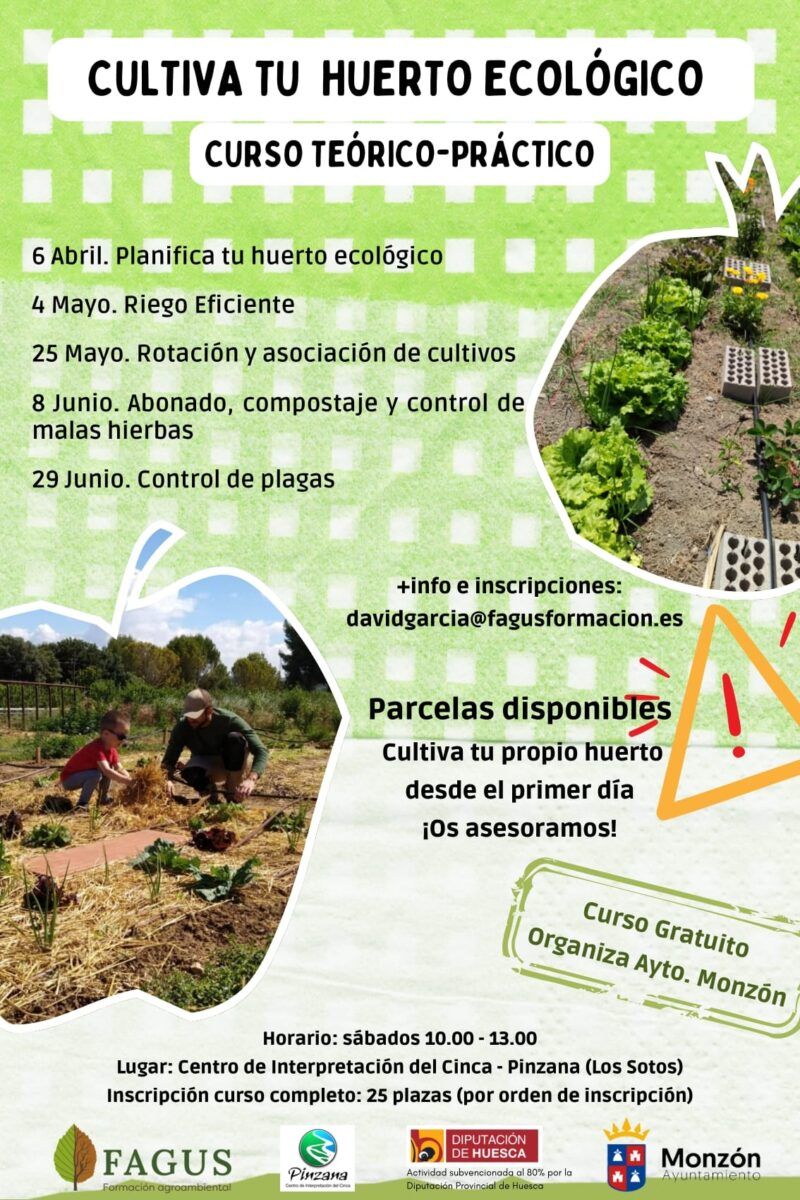El Ayuntamiento de Monzón organiza un curso gratuito: «Cultiva tu huerto ecológico», una iniciativa que comenzará este próximo 6 de abril y que se prolongará hasta finales de junio -un sábado al mes-. Una propuesta destinada a 25 personas y que cuenta con formación teórico-práctica, nos explica en que consiste la iniciativa David García de FAGUS Formación, que es el encargado de impartir el curso.