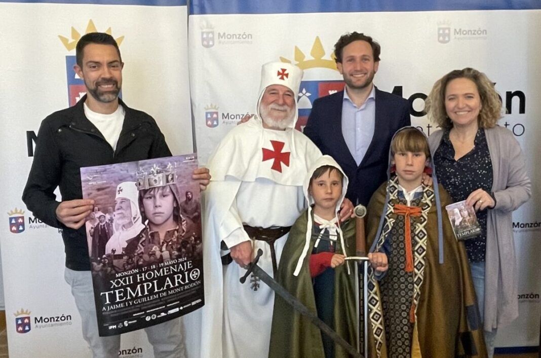 El alcalde de Monzón, Isaac Claver, la concejal de Turismo, Marta Montaner, el concejal de Ferias, Jairo Sánchez, y José Manuel Baena (Mont-rodón), Jaime I (Mauro Manero) y Gabriel Mumbiela (Ramón de Berenguer) han presentado la XXI edición del Homenaje Templario a Jaime I y Guillem de Mont-rodón y la XVIII edición de la Feria de Artes y Oficios Tradicionales, que se celebrará los próximos 17, 18 y 19 de mayo.