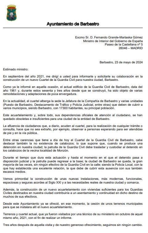 El Alcalde Fernando Torres ha vuelto a reclamar al Ministro del Interior Fernando Grande-Marlaska la construcción de un nuevo cuartel de la Guardia Civil en Barbastro. En esta ocasión, el primer edil barbastrense lo hace mediante una misiva directa que se cursó a finales de este mes de mayo. El envío de la carta llega después de que el Pleno Municipal aprobase en su sesión del pasado mes de marzo una moción en la que, precisamente, se instaba al Ministerio del Interior a a abordar este proyecto. El actual cuartel de la Guardia Civil de Barbastro data de 1961 y durante los 63 años que lleva en servicio ha sido objeto de adaptaciones menores y remodelaciones de escasa envergadura. El cuartel carece actualmente de calabozos (lo que obliga a trasladar a los detenidos a Monzón) y no ofrece viviendas de calidad a los agentes que prestan servicio en el equipamiento.