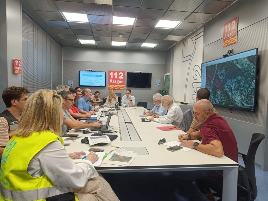Esta mañana se ha celebrado en la sede del centro de emergencias 112 Aragón una reunión del Centro de Coordinación Operativa (CECOP), presidida por la vicepresidenta y consejera de Presidencia, Economía y Justicia, Mar Vaquero, el consejero de Hacienda, Interior y Administración Pública, Roberto Bermúdez de Castro, y el director general de Interior y Emergencias, Miguel Ángel Clavero.