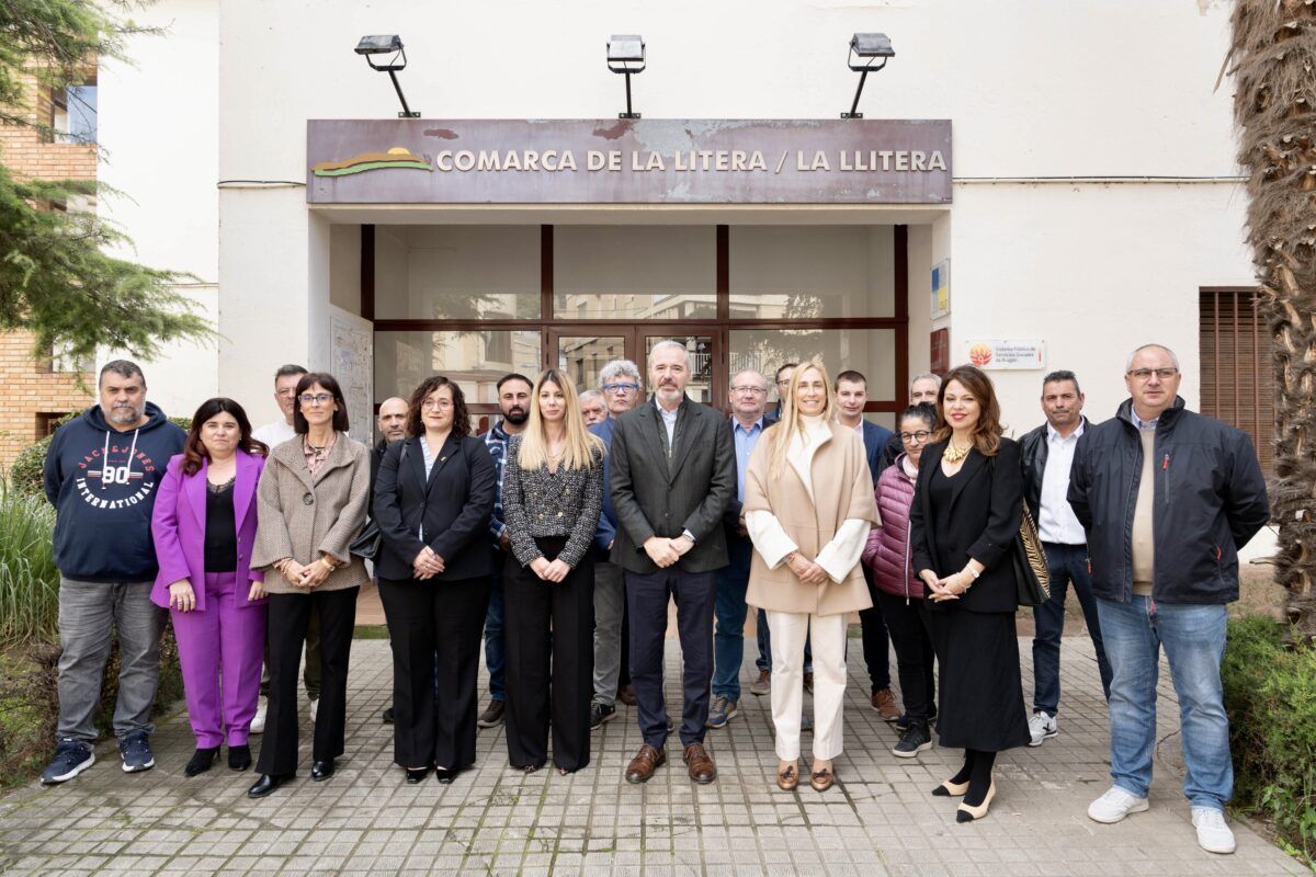 Imagen del presidente Azcón y los consejeros comarcales a las puertas de la sede de Tamarite de Litera