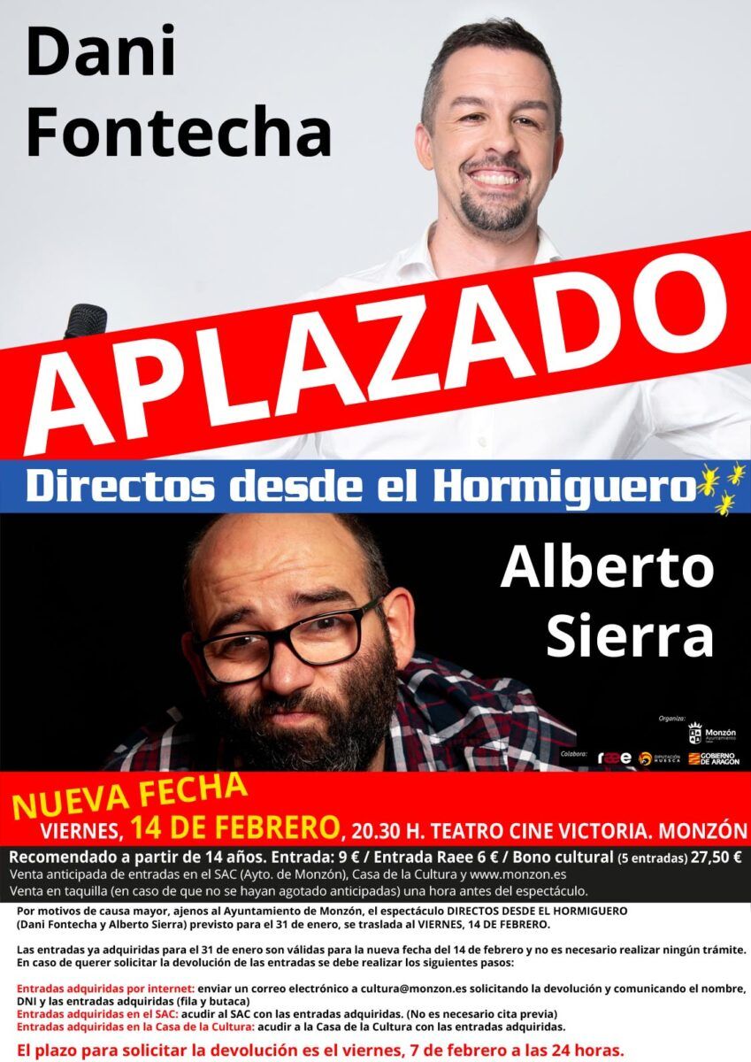 La concejalía de Cultura informa que por motivos de causa mayor, ajenos al Ayuntamiento de Monzón, el espectáculo Dani Fontecha y Alberto Sierra, Directos desde El Hormiguero, previsto para el 31 de enero, se traslada al viernes, día 14 de febrero, a las 20:30h en el Teatro Victoria.