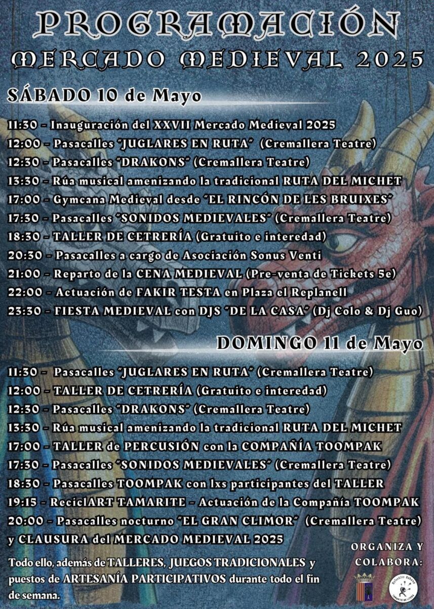El mercado medieval arrancará el sábado con muchas actividades, donde se volverá a disfrutar del rincón de las brujas en una nueva ubicación y desde donde saldrá una yincana para los más pequeños con la que se pretende “dinamizar diferentes puntos del municipio por los alrededores del mercado”, recalcó Ana Ferrer, del Kolectivo Kabana. La noche concluirá con una cena con precios populares cuyos tickets podrán adquirirse desde el 28 de abril al 6 de mayo en la librería Calarión. “La cena estará amenizada por el Fakir Testa que ofrecerá un espectáculo que desafía los límites del cuerpo. Este artista tiene un gran palmarés artístico y ha actuado en más de 20 países y participó en Got Talent España. Creemos que esa actuación no dejará indiferente a nadie. Y a continuación cerraremos la sesión con los djs ‘de la casa’ (Dj Colo & Dj Guo)”.