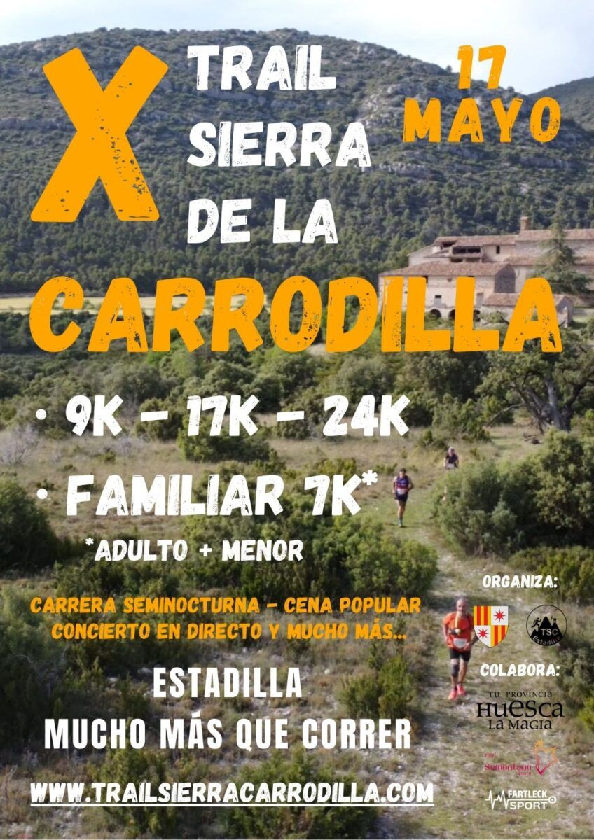 El Ayuntamiento de Estadilla organiza el sábado 17 de mayo la X Edición de la Trail Sierra de la Carrodilla con tres recorridos para atraer al mayor número de participantes, desde habituales a las carreras de montaña a corredores que desean iniciarse en este tipo de competiciones. Los tres itinerarios propuestos tienen 9,5 kms y 400 de desnivel cumulado, 17 kms y 600 de desnivel acumulado y la prueba reina de 24 kms y más de 1.000 m de desnivel acumulado. Además, para iniciar a los niños a partir de 12 – 14 años en las carreras de montaña se ha creado una ruta accesible de 7 kms en la que los padres podrán recorrerla con sus hijos.