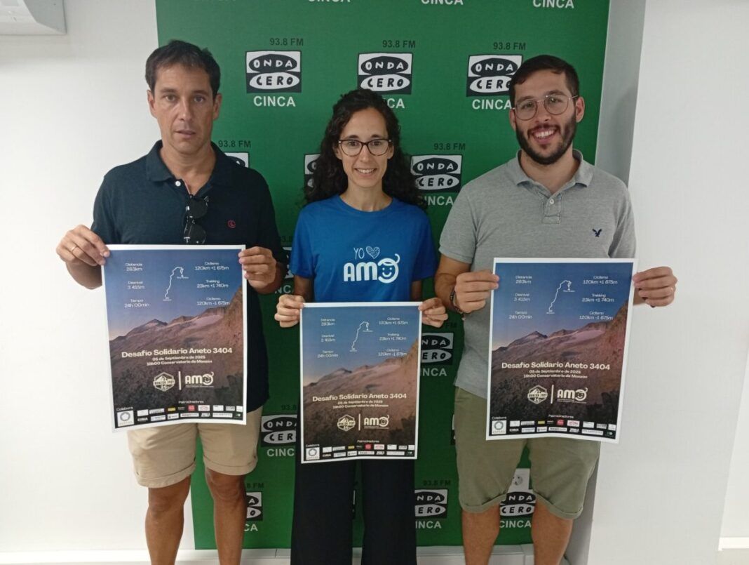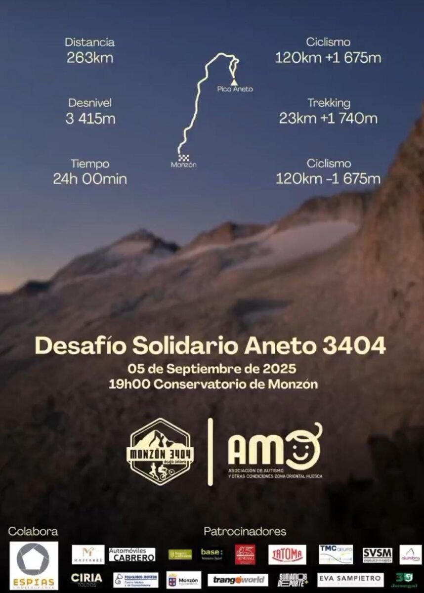La salida hacia el punto más alto de la comunidad autónoma aragonesa, tendrá lugar a las 19 horas en el Conservatorio de Monzón. Desde allí los participantes –apoyados por varios vehículos- saldrán en bicicleta hasta Llanos del Hospital (120 kilómetros y 1.675 metros de desnivel), desde allí ascenderán al Aneto situado a 3.404 metros y regresarán a Llanos del Hospital (23 kilómetros y 1.740 metros de desnivel) donde volverán a coger sus bicicletas para regresar por carretera dando pedales hasta la capital mediocinqueña. El objetivo: completarlo en menos de 24 horas, un reto de altura y que además cada edición pone su granito de arena ayudando económicamente a una asociación de nuestro territorio. Isra Tena y Sergio Batista participantes en el «Desafío» y Naiara Hernández, de la Asociación AMO nos cuentan los detalles de la quinta edición de esta iniciativa.