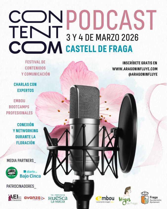 Martes 3 de marzo – Jornada «Podcast y Territorio» (Gratuita): Enfocada al análisis del branded podcast y las tendencias de consumo de contenidos en redes sociales. Contará con expertos nacionales y la emisión en directo de un programa de Onda Cero Cinca. Las inscripciones para esta jornada gratuita ya están abiertas en la web oficial del evento www.aragoninfluye.com.