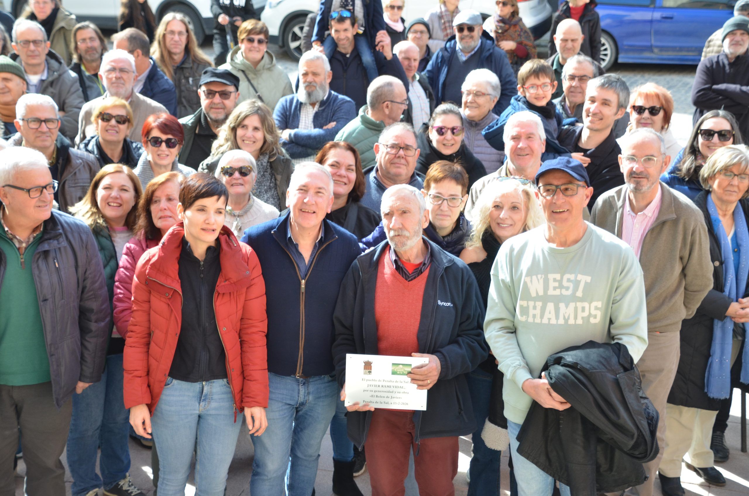Hoy cumple años y el bueno de Javier, ¡sí, el del popular “Belén de Javier!, imaginaba llamadas habituales, felicitaciones nominales y una comida entre cercanos con pastel y velas de postre. Pero, lo que no podía pensar era en un mediodía en la Plaza Mayor de Peralta de la Sal con medio centenar de vecinos y amigos -hasta colegas de los belenes de Lagunarrota y Monzón- dispuestos a rendir homenaje a un hombre bueno, generoso, dispuesto para todos y con una maña singular para crear, siguiendo los pasos de su padre, un belén casero y único. Todos lo hemos disfrutado y nos ha sorprendido a lo largo de los cuarenta años de exposición navideña en el garaje de su propio domicilio petraltense.