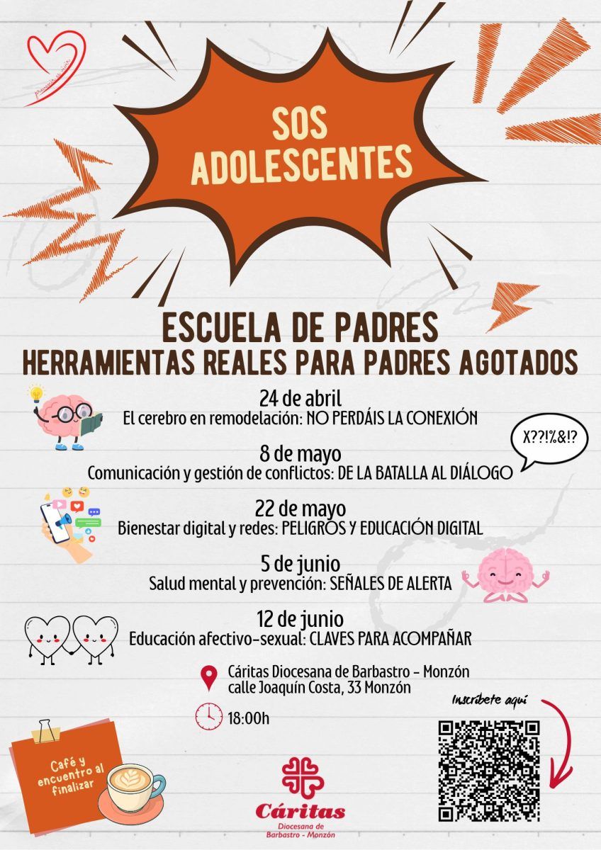 Cáritas Diocesana de Barbastro-Monzón pone en marcha “SOS Adolescentes: herramientas reales para padres agotados”, una nueva propuesta en formato escuela de padres que nace para dar respuesta a una realidad cada vez más presente: la dificultad de muchas familias para acompañar a sus hijos e hijas en la etapa de la adolescencia.